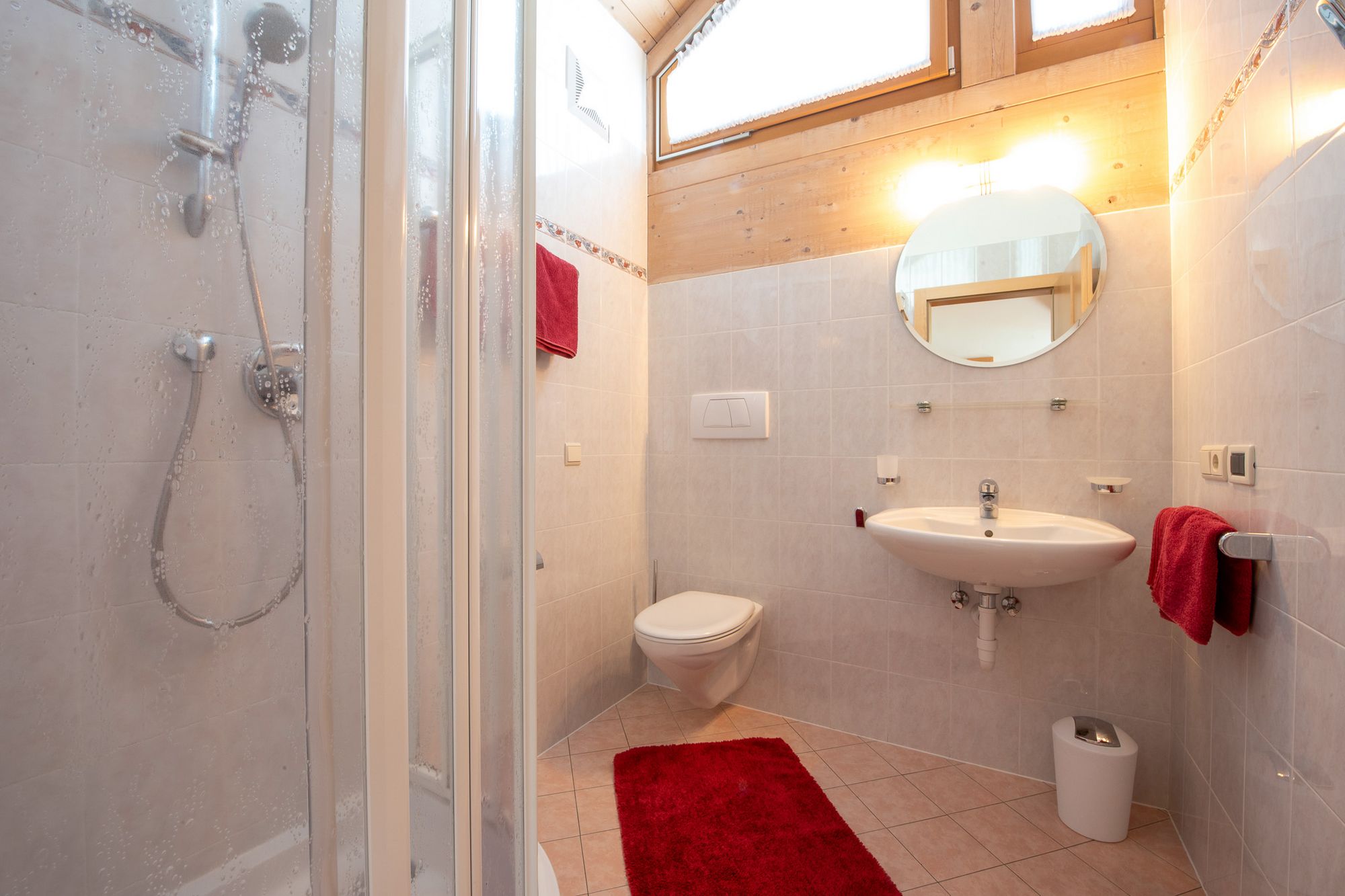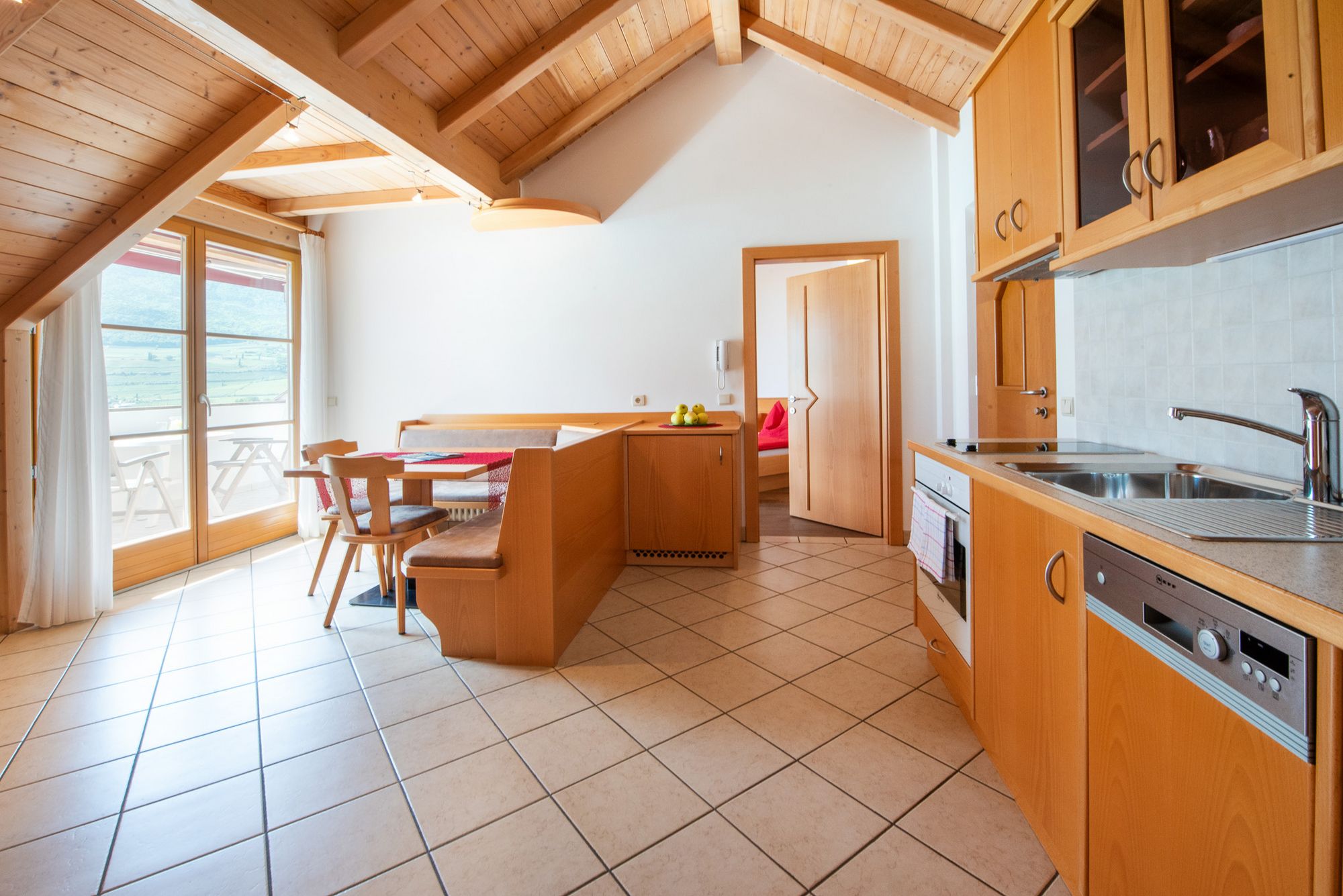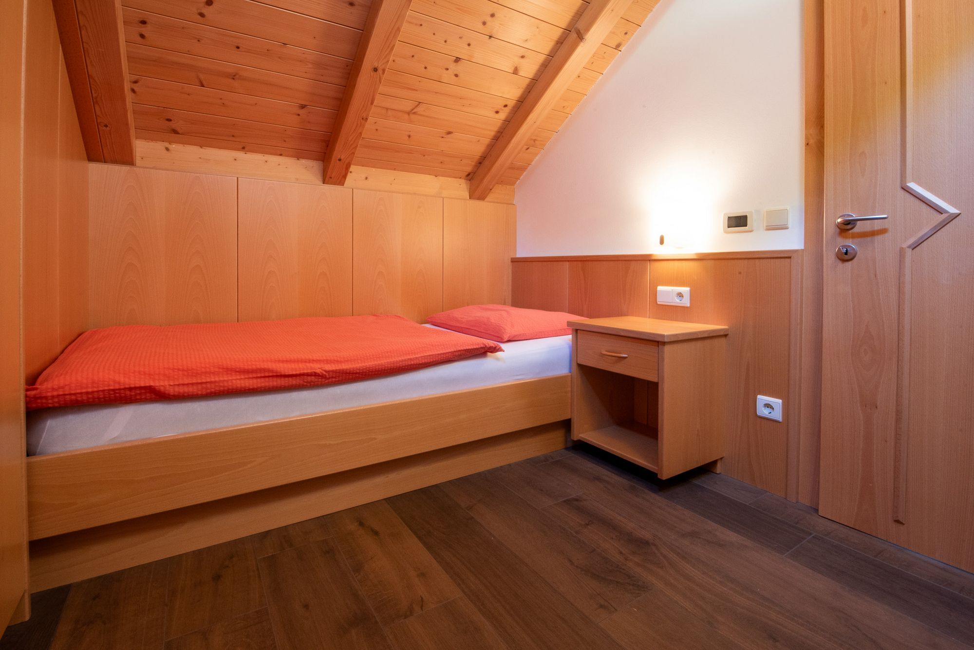 Diese Wohnung befindet sich im Dachgeschoß bietet viel Raum für Erholung und Behaglichkeit und verfügt von einer Wohnküche mit Küchenzeile und Eckbank, einer großen Garderobe, Bad, ein Doppeltbettzimmer und ein Schlafzimmer mit drei getrennten Betten.